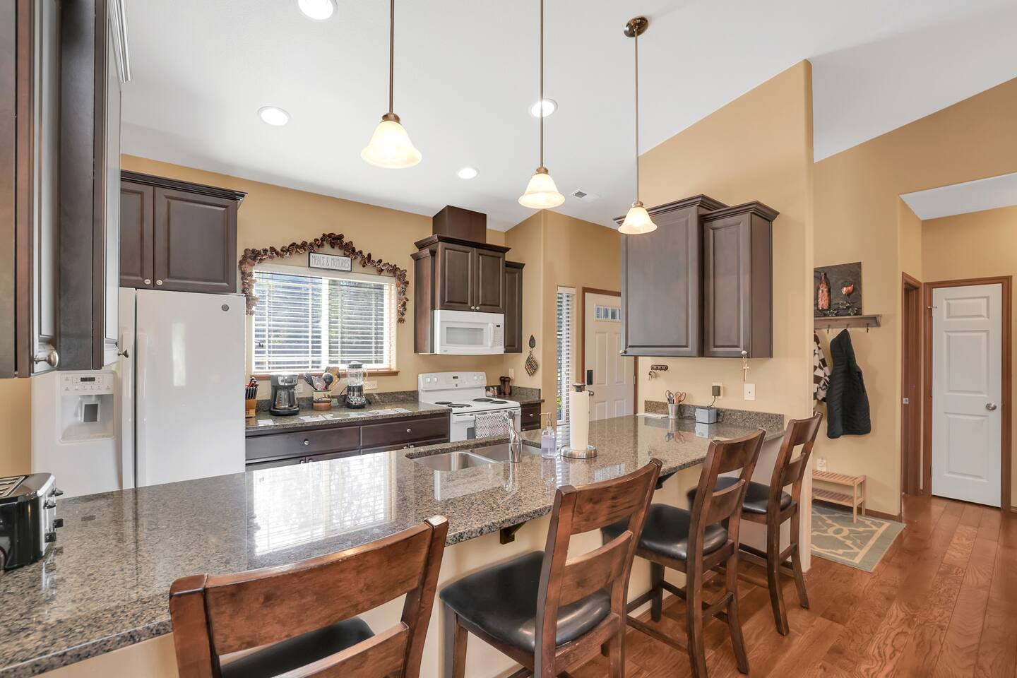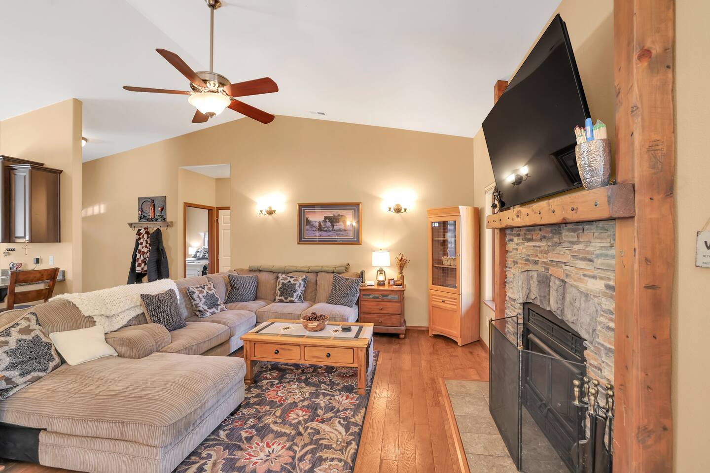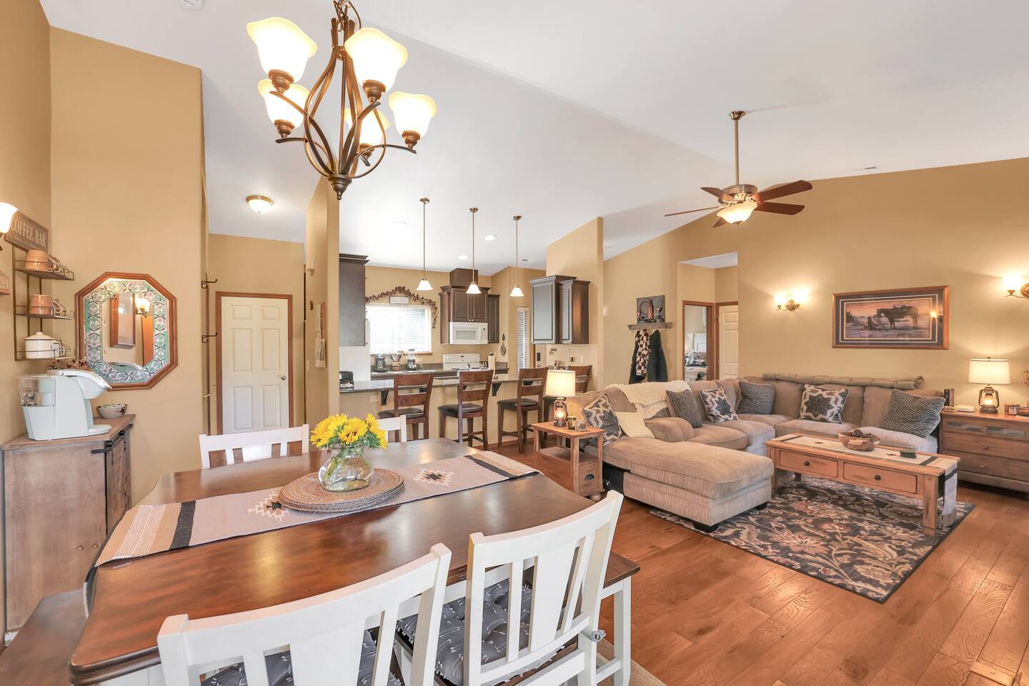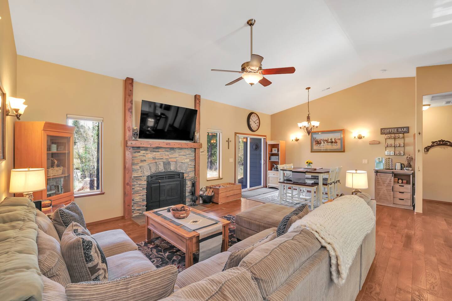Step inside to vaulted ceilings, warm wood accents, and a cozy living room anchored by a stone fireplace and smart TV — perfect for movie nights or curling up after a day outdoors. The fully equipped kitchen with granite counters and bar seating makes cooking easy, while the dining area is ideal for shared meals and board games.
