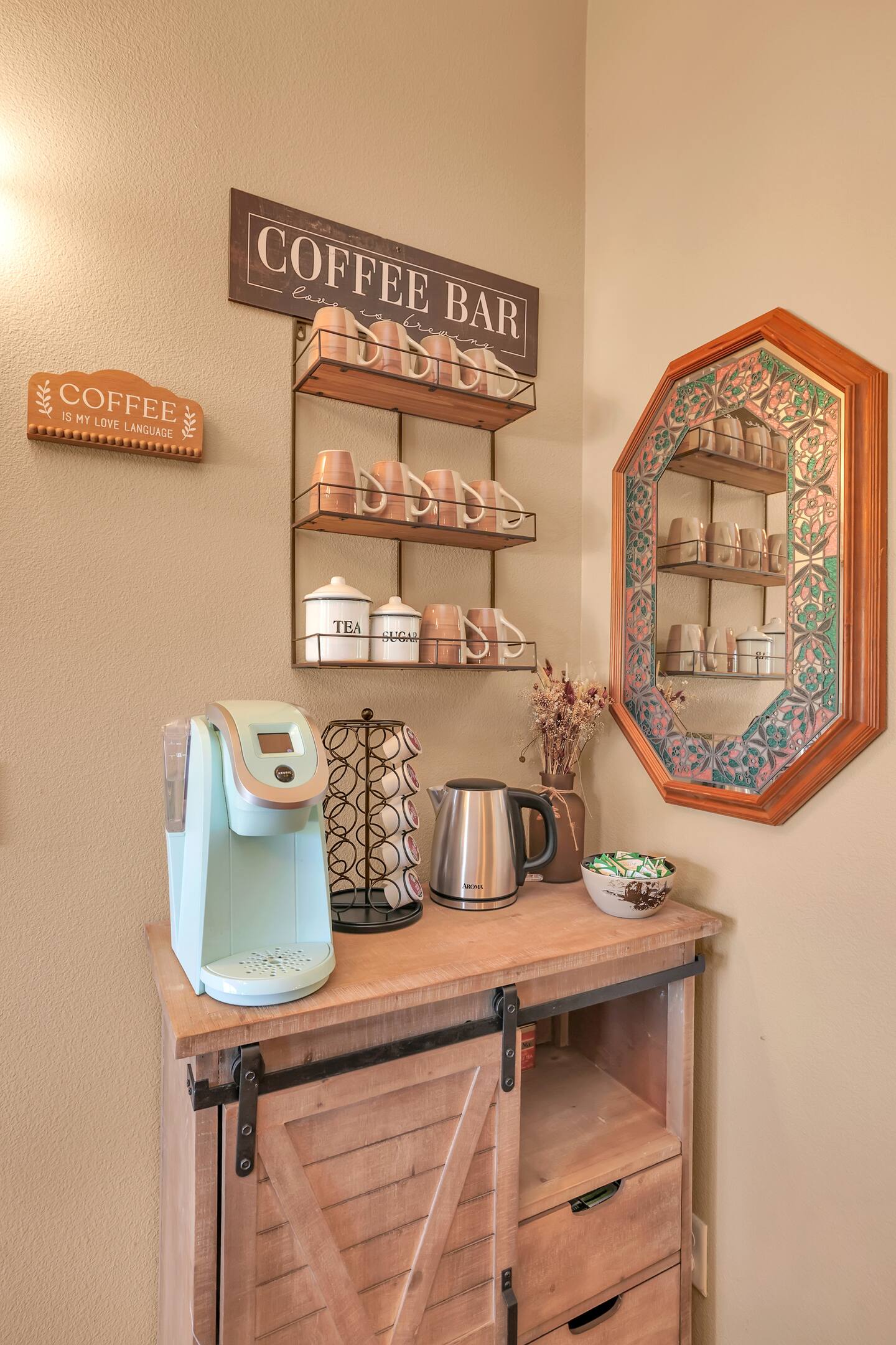Two bathrooms, a laundry room, and thoughtful touches like a dedicated coffee bar ensure comfort and convenience throughout your stay.