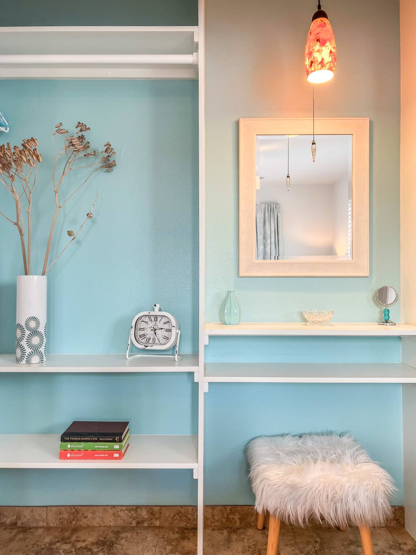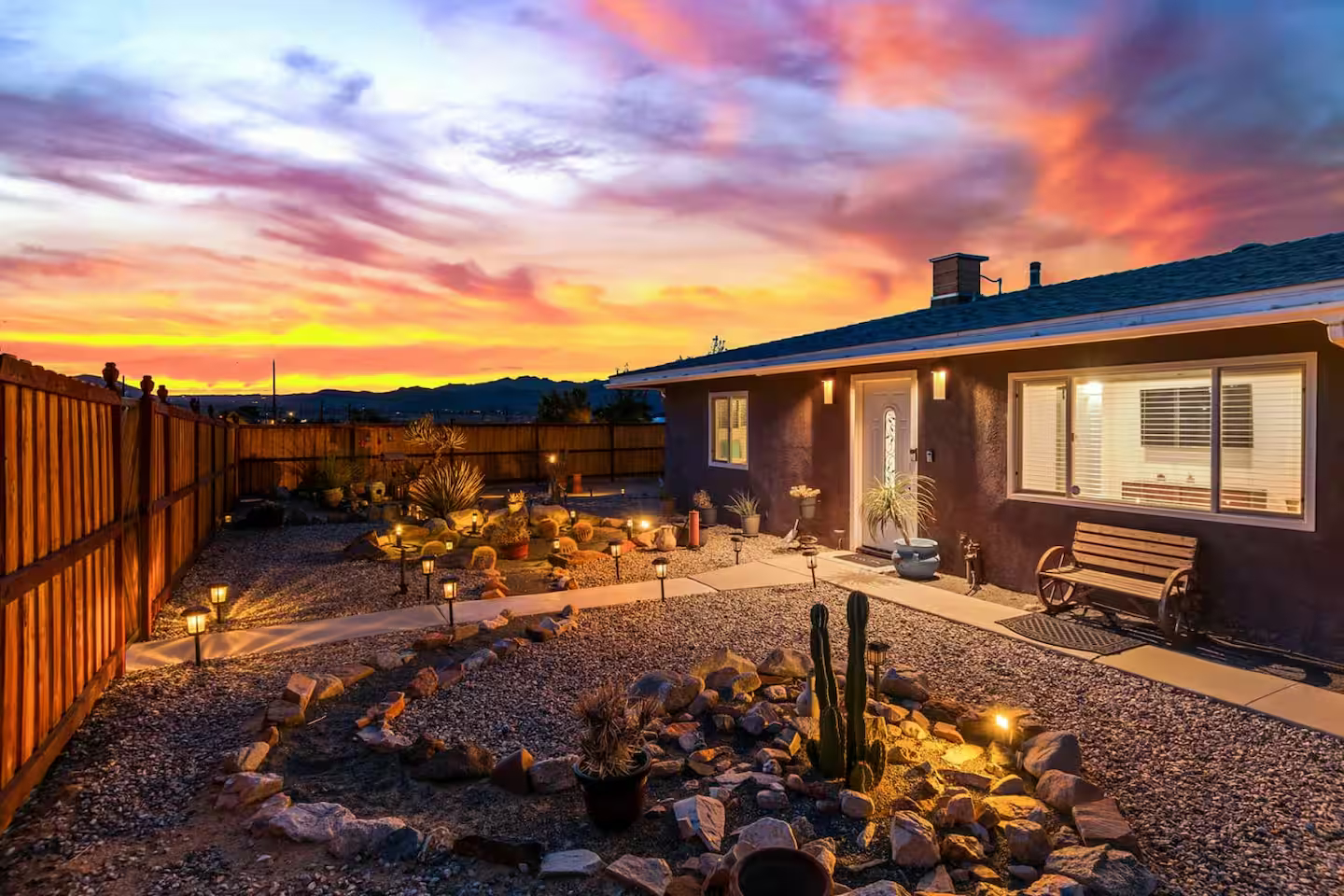 A zen oasis, Haven Rock features a clean, contemporary interior and a resort-like exterior. The private fenced backyard with luscious greenery, river rock lawn, and series of sun sails makes it the perfect place to hang out day or night. With a variety of seating areas including comfortable rattan furniture, a wagon wheel bench, a porch swing and a hanging chaise, there’s enough options for everyone to relax and unwind their way while you admire the beautiful mountain views and painted desert skies.