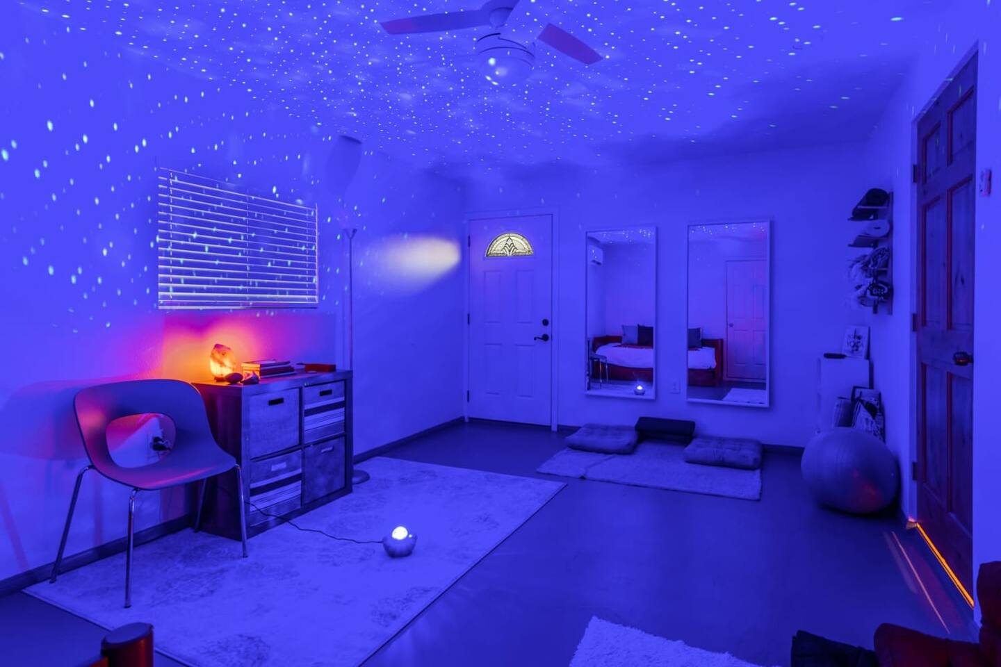 Take a break Inside and center yourself in the Zen Room. With plenty of space for everyone to practice Warrior, Half Moon and Dancing Shiva, or simply go within and be still. Sit full lotus or engage your core and find balance on the stability ball as you practice mindfulness. Light the LED candles and heal your chakras, or explore the world of crystals and achieve a mentally clear and emotionally calm and stable state. Learn and practice some new massage techniques including Effleurage, Petrissage and Tapotement. The Himalayan salt lamp is sure to boost your mood and improve your sleep. Too relaxed to move? You don’t have to – thanks to the daybed / trundle bed and starry mood lighting.